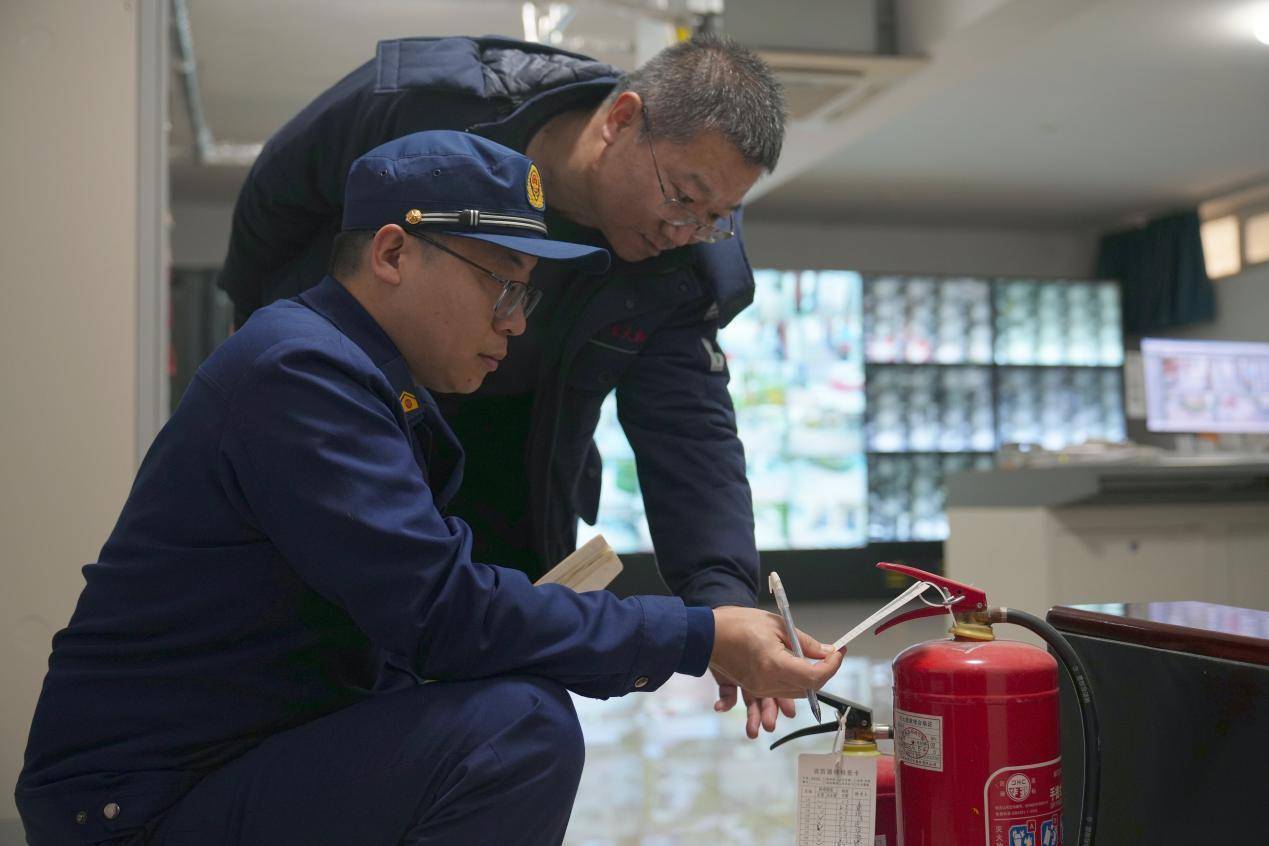 任丘市消防救援大队工作人员正在检查灭火器。韩慧峰摄