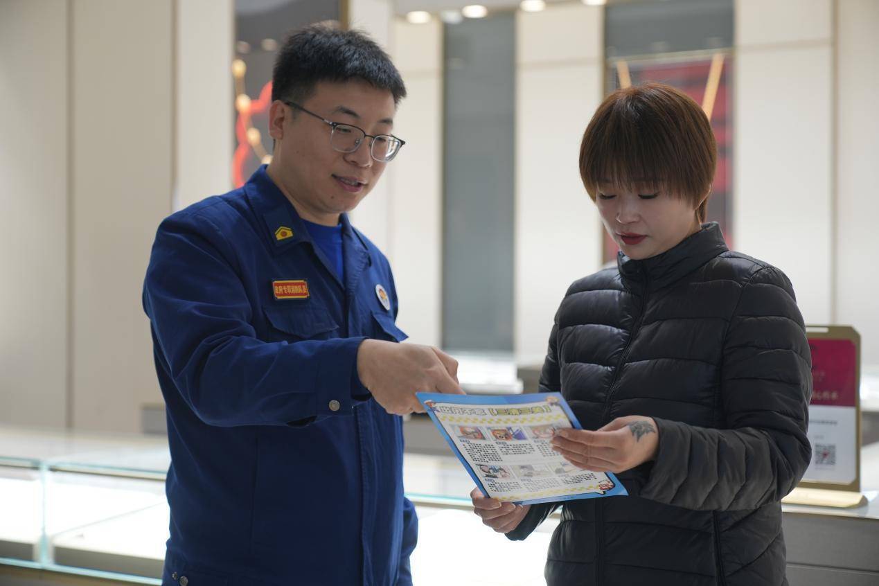 任丘市消防救援大队工作人员在商场发放消防安全宣传单。韩慧峰摄