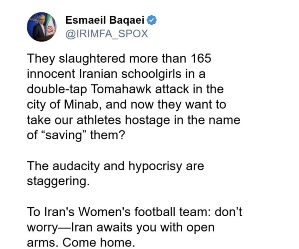 对于伊朗女足队员的担忧,伊朗外交部发言人伊斯梅尔-巴加埃今日公开做出回应:“致伊朗女足足球队:不要担心,伊朗张开双臂,等待你们回来。回家吧。”
