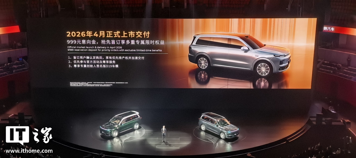 据IT之家了解,零跑 D19 将于 4 月 16 日正式上市,尺寸为 5252×1995×1780mm、轴距 3110mm,提供 6 座 / 7 座可选;搭载 80.3kWh 超大增程专属电池(宁德时代超混电芯)、车规级森野氧舱、电动开合冷暖冰箱、12 层奢享级座椅、二排右侧真零重力座椅、三排超大空间贵宾座。